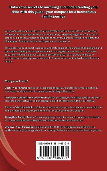 Are you struggling to manage your emotions and keep calm during parenting challenges? Do you find yourself in a cycle of conflict with your children and wish for more cooperative interactions? Are you looking for a comprehensive guide that combines practical advice with actionable steps to master your emotions and strengthen your family bonds? Discover the Path to Emotional Mastery and Transformative Parenting with "Anger Management for Parents" In today's fast-paced world, where stress often finds its way into our homes and influences our interactions with our loved ones, "Anger Management for Parents " stands as a beacon of hope and guidance for every parent striving to navigate the challenges of raising children with grace and composure. What sets this book apart is its deep understanding of the parent-child dynamic and the unique challenges that parents face in managing their emotions. It's not just about controlling anger; it's about understanding its roots, transforming your reactions, and creating an environment of cooperation and mutual respect in your family. This guide combines practical strategies, personal reflections, and actionable steps that parents can implement immediately, making it an indispensable tool for anyone looking to foster a harmonious family life. Don't let stress and anger dictate the tone of your family life. Take the first step towards a calmer, more connected home by purchasing "Anger Management for Parents" today. Embrace the journey of transformation and witness the profound impact it will have on your relationships and your life. Click the "Buy Now" button and start your path to emotional mastery and a harmonious family dynamic. What you will Learn? ¿ Master Your Emotions: Learn to recognize triggers and patterns in your emotional responses, and gain tools to manage your feelings effectively. ¿ Transform Conflict into Cooperation: Discover strategies to diffuse tension, address conflicts constructively, and encourage
