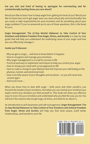 Are you sick and tired of having to apologize for overreacting and for unintentionally hurting those you care about? Would you like to learn how to keep anger from getting the best of you? Would you like to know how not to get anger wear you down physically and emotionally? Are you ready to take responsibility for your emotions and do something about your anger problem? If you've answered yes to any of these questions, this is the book for you! Anger Management: The 21-Day Mental Makeover to Take Control of Your Emotions and Achieve Freedom from Anger, Stress, and Anxiety is a step-by-step guide that will help you understand the underlying cause of your anger and how you can effectively manage it. Inside you'll discover: Why we get so angry... and how to know before it happens How to recognize and manage your emotions Why anger management is crucial for success in life Practical and easy to implement techniques to help you control your anger How to remap your mind with a new approach to life How to make a change in your lifestyle that will improve your well-being on the physical, mental, and emotional level How to be fully aware of your thoughts and emotions - so you will never lose control again And much more... When you know how to deal with anger - both yours and other people's, you become the master of your emotions. And when you can control your emotions you easily control any situation you find yourself in. This book will show you effective ways to tune into your emotions and understand why you feel the way you do. You will learn the reasons why we get angry at times, and what to do about it. An introduction to self-awareness and self-management, Anger Management: The 21-Day Mental Makeover to Take Control of Your Emotions and Achieve Freedom from Anger, Stress and Anxiety will help you find inner peace, build better relationships, and transform your life. So what are you waiting for? Click "Buy Now" and take your first step to becoming anger, stress, and anxiety-free today!