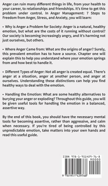 Anger Mangement Book Series #1 Anger can ruin many different things in life, from your health to your career, to relationships and friendships. It's time to get this problem under control. In Anger Management: 7 Steps to Freedom from Anger, Stress, and Anxiety, you will learn: Why is Anger a Problem for Society: Anger is a natural, healthy emotion, but what are the costs of it running without control? Our society is becoming increasingly angry, and it's harming not just ourselves, but others. Where Anger Came from: What are the origins of anger? Surely, this prevalent emotion has to have a source. Chapter one will explain this to help you understand where your emotion springs from and how best to handle it. Different Types of Anger: Not all anger is created equal. There's anger at a situation, anger at another person, and anger at ourselves. Understanding these distinctions can help you find healthy ways to deal with the emotion. Handling the Emotion: What are some healthy alternatives to burying your anger or exploding? Throughout this guide, you will be given useful tools for handling the emotion in a balanced, assertive way. By the end of this book, you should have the necessary mental tools for becoming assertive, rather than aggressive, and calm when necessary. If you're tired of being controlled by this unpredictable emotion, take matters into your own hands and read this useful guide.