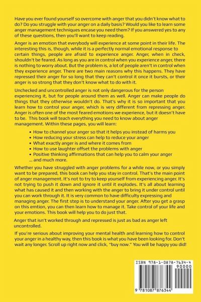 Have you ever found yourself so overcome with anger that you didn’t know what to do? Do you struggle with your anger on a daily basis? Would you like to learn some anger management techniques encase you need them? If you answered yes to any of these questions, then you’ll want to keep reading. Anger is an emotion that everybody will experience at some point in their life. The interesting this is, though, while it is a perfectly normal emotional response to certain things, people are afraid to experience anger. Anger, when in check, shouldn’t be feared. As long as you are in control when you experience anger, there is nothing to worry about. But the problem is, a lot of people aren’t in control when they experience anger. There are two main reasons why this happens. They have repressed their anger for so long that they can’t control it once it bursts, or their anger is so strong that they don’t know what to do with it. Unchecked and uncontrolled anger is not only dangerous for the person experiencing it, but for people around them as well. Anger can make people do things that they otherwise wouldn’t do. That’s why it is so important that you learn how to control your anger, which is very different from repressing anger. Anger is often one of the most feared emotions we experience, but it doesn’t have to be. This book will teach everything you need to know about anger management. Whether you have struggled with anger problems for a while now, or you simply want to be prepared, this book can help you stay in control. That’s the main point of anger management. It’s not to try to keep yourself from experiencing anger. It’s not trying to push it down and ignore it until it explodes. It’s all about learning what has caused it and then working with the anger to bring it under control until you can work through it. It is very common to have difficulty expressing and managing anger. The first step is to understand your anger. After you get a grasp on this emtion, you can then learn how to manage it. Take control of your life and your emotions. This book will help you to do just that. Anger that isn’t worked through and repressed is just as bad as anger left uncontrolled. If you’re serious about improving your mental health and learning how to control your anger in a healthy way, then this book is what you have been looking for. Don’t wait any longer. Scroll up right now and click, "buy now." You will be happy you did!