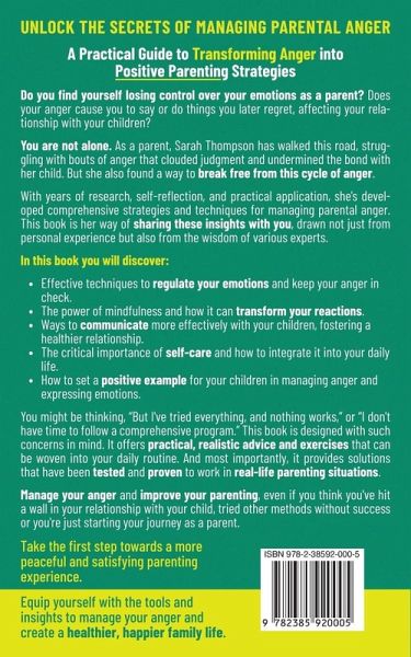 Unlock the Secrets of Managing Parental Anger A Practical Guide to Transforming Anger into Positive Parenting Strategies Do you find yourself losing control over your emotions as a parent? Does your anger cause you to say or do things you later regret, affecting your relationship with your children? You are not alone. As a parent, Sarah Thompson has walked this road, struggling with bouts of anger that clouded judgment and undermined the bond with her child. But she also found a way to break free from this cycle of anger. With years of research, self-reflection, and practical application, she's developed comprehensive strategies and techniques for managing parental anger. This book is her way of sharing these insights with you, drawn not just from personal experience but also from the wisdom of various experts. In this book you will discover: Effective techniques to regulate your emotions and keep your anger in check The power of mindfulness and how it can transform your reactions Ways to communicate more effectively with your children, fostering a healthier relationship The critical importance of self-care and how to integrate it into your daily life How to set a positive example for your children in managing anger and expressing emotions ... and much more ! You might be thinking, "But I've tried everything, and nothing works," or "I don't have time to follow a comprehensive program." This book is designed with such concerns in mind. It offers practical, realistic advice and exercises that can be woven into your daily routine. And most importantly, it provides solutions that have been tested and proven to work in real-life parenting situations. Manage your anger and improve your parenting, even if you think you've hit a wall in your relationship with your child, tried other methods without success or you're just starting your journey as a parent. Take the first step towards a more peaceful and satisfying parenting experience. Equip yourself with the tools and insights to manage your anger and create a healthier, happier family life.
