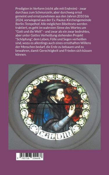 Predigten in Verform (nicht alle mit Endreim) - zwar durchaus zum Schmunzeln, aber durchweg ernst gemeint und ernstzunehmen aus den Jahren 2010 bis 2024, vorwiegend aus der Ev. Paulus-Kirchengemeinde Berlin-Tempelhof. Alle möglichen Bibeltexte werden traktiert, es geht im wahrsten Sinne des Wortes um "Gott und die Welt" - und zwar als ein zwar bedrohtes, aber unter Gottes Verheißung stehenden Projekt "Schöpfung", dem Leben, Fülle und Segen verheißen sind, wozu es allerdings auch eines ernsthaften Willens der Menschen bedarf, die Erde zu bebauen und zu bewahren, damit Gerechtigkeit und Frieden sich küssen können.