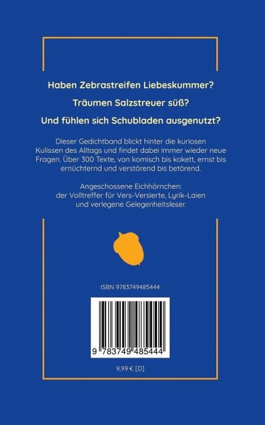 Haben Zebrastreifen Liebeskummer?Träumen Salzstreuer süß?Und fühlen sich Schubladen ausgenutzt?Dieser Gedichtband blickt hinter die kuriosen Kulissen des Alltags und findet dabei immer wieder neue Fragen. Über 300 Texte, von komisch bis kokett, ernst bis ernüchternd und verstörend bis betörend.Angeschossene Eichhörnchen: der Volltreffer für Vers-Versierte, Lyrik-Laien und verlegene Gelegenheitsleser.