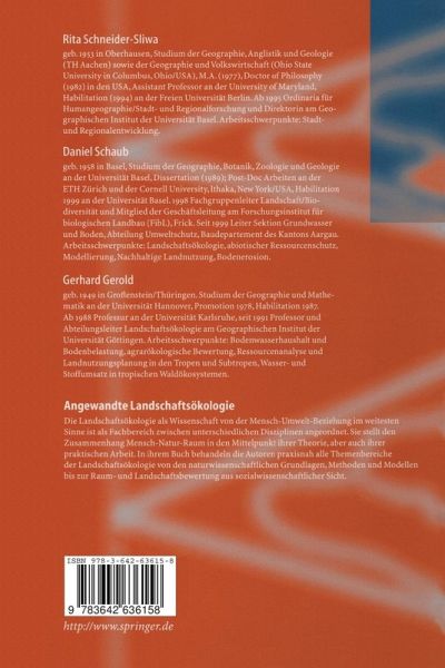 Angewandte Landschaftsökologie - Betrachtungen zu einem zentralen Ansatz der Umweltforschung.- Grundlagen der Angewandten Landschaftsökologie.- 1 Angewandte Landschaftsökologie - Inhalte, Stellung und Perspektiven.- 2 Ökosystemare Modellvorstellungen und Ökosystemmodelle in der Angewandten Landschaftsökologie.- 3 Die Theorie der geographischen Dimensionen in der Angewandten Landschaftsökologie.- 4 Logik und Logistik des Systemkonzepts der naturwissenschaftlichen Geographie.- 5 Naturschutzziele in der Angewandten Landschaftsökologie.- Methodik der Angewandten Landschaftsökologie Allgemeine Methoden und Modelle in der Angewandten Landschaftsökologie.- 6 Dynamische Landschaftsmodelle für die Angewandte Landschaftsökologie.- 7 Landschaftsökologische Methoden zur Analyse, Beurteilung und Prognose in der Umweltplanung.- 8 Mittelmaßstäbige Raumbewertungen für die Angewandte Landschaftsökologie.- 9 Großräumige Raummodelle für die Angewandte Landschaftsökologie.- 10 Geographische Informationssysteme (GIS) und raumbezogene Prozeßmodellierung in der Angewandten Landschaftsökologie.- 11 Fernerkundung als Instrument der Landschaftsökologie.- Faktoren- und Prozeßbezogene Methoden und Modelle in der Angewandten Landschaftsökologie.- 12 Georeliefklassifikation.- 13 Stoffhaushalt des Bodens in Laborexperimenten.- 14 Von der Bodenerosionsforschung zum angewandten Bodenschutz.- 15 Landschaftswasserhaushalt - ein zentrales Thema der Landschaftsökologie.- 16 Regionalisierte Modellierung des Bodenwasserhaushalts.- 17 Methoden und Praxis der Altlastenerkundung.- Raumbewertungen in der Angewandten Landschaftsökologie.- 18 Gutes Klima - schlechtes Klima: Lässt sich das Klima bewerten?.- 19 Berwertungsmöglichkeiten stadtklimatischer Belange.- 20Bioklimatische Raumbewertung.- 21 Biogeographische Raumanalyse und Raumbewertung mit Tieren.- 22 Biogeographische Raumbewertung mit Pflanzen.- Landschaftsbewertung aus sozialwissenschaftlicher Sicht.- 23 Interdisziplinäre Argumentation zum Tatbestand "Bodenverunreinigung" - Grundlagen, ökologische und juristische Argumente.- 24 Bewertungsprobleme bei der Umnutzung von Landschaft - Umweltsoziaiwissenschaftliche Erklärungsansätze.- 25 Die Kolonisierung der Landschaft: Landnutzung und gesellschaftlicher Stoffwechsel.- 26 Ökopsychologische Bewertung des Raumes und der Landschaft.- Nachwort.- Autoren- und Herausgeberverzeichnis.