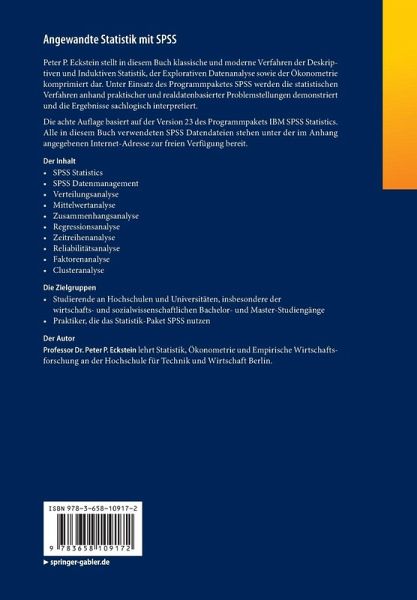 Peter P. Eckstein stellt in diesem Buch klassische und moderne Verfahren der Deskriptiven und Induktiven Statistik, der Explorativen Datenanalyse sowie der Ökonometrie komprimiert dar. Unter Einsatz des Programmpaketes SPSS werden die statistischen Verfahren anhand praktischer und realdatenbasierter Problemstellungen demonstriert und die Ergebnisse sachlogisch interpretiert. Die achte Auflage basiert auf der Version 23 des Programmpakets IBM SPSS Statistics. Alle in diesem Buch verwendeten SPSS Datendateien stehen unter der im Anhang angegebenen Internet-Adresse zur freien Verfügung bereit.