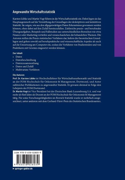 Karsten Lübke und Martin Vogt führen in die Wirtschaftsstatistik ein. Dabei legen sie das Hauptaugenmerk auf die Vermittlung der Grundlagen der deskriptiven und induktiven Statistik. Sie zeigen, wie aus den allgegenwärtigen Daten Erkenntnisse gewonnen werden können, ohne dabei auf den Zufall hereinzufallen. Zahlreiche praxis- und berufsnahe Übungsaufgaben, Beispiele und Fallstudien aus unterschiedlichen Bereichen wie etwa Finance oder Marketing vertiefen und veranschaulichen die behandelten Themen. Die Autoren stellen die Praxis statistischer Verfahren dar, liefern die theoretischen Grundlagen und gehen sowohl auf berufspraktische und wissenschaftliche Aspekte als auch auf die Umsetzung am Computer ein, sodass die Verfahren von Studierenden und von Praktikern mit Gewinn eingesetzt werden können.