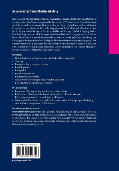 PD Dr. Stefan Hoffmann vertritt den Lehrstuhl für Marketing an der Universität Rostock, Dr. Uta Schwarz und Dr. Robert Mai sind wissenschaftliche Mitarbeiter am Lehrstuhl für Marketing der TU Dresden. Die Autoren sind renommierte Verteter aus den Bereichen Marketing, Medizin, Ernährungswissenschaft, Psychologie, Volkswirtschaftslehre und Kommunikationsmanagement.