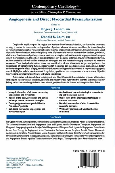 Despite the rapid progress in surgical and catheter-based revascularization, an alternative treatment strategy is needed for the ever-increasing number of patients who are either not candidates for these therapies or remain symptomatic after revascularization and maximal ongoing medical treatment. In Angiogenesis and Direct Myocardial Revascularization, an interdisciplinary panel of pioneers and opinion leaders review the basic, preclinical, clinical, and developmental pathways to new treatment strategies, such as therapeutic angiogenesis and myogenesis. In their assessments, the authors take advantage of new biological understanding, novel therapeutic targets, multiple available and well-studied therapeutic strategies, and the necessary imaging techniques to measure outcomes. Their in-depth discussions cover the identification of new therapeutic targets and pathways, the investigation of transcriptional factors, master switch molecules, cell-based approaches, chemokines, a better understanding of the effects of aging, endothelial dysfunction, and hypercholesterolemia in response to angiogenic stimuli. Highlights include examination of drug delivery problems, outcomes measure, stem therapy, high-risk interventions, development pathways, and future possibilities.