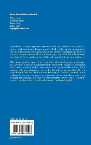 Angiogenesis is attracting increased scientific and clinical interest. The identification of novel mediators and targeting molecules has led to significant progress in our understanding of tumor angiogenesis and tumor vessel targeting. Important advances in cancer treatment have already emerged, and in the future, blood vessel targeting will play a significant role within individualized therapeutic strategies. This volume provides a general overview of the latest developments in angiogenesis inhibition in cancer. All aspects from the bench to the bedside are considered, with detailed attention both to basic research and to its translation into clinical practice. Individual chapters are devoted to the roles of angiopoietins, HIF-1a, chemokines, PDGF and VEGF, and vascular integrins. The latest results of clinical trials are presented, and various advanced targeting strategies are discussed. This book will be invaluable to all who wish to learn of the most recent advances in this exciting field.