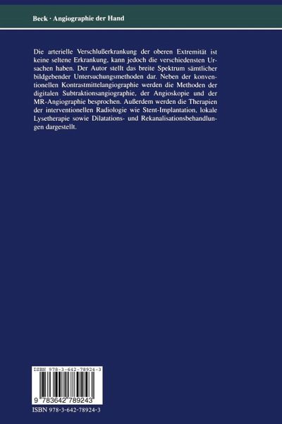 Die arterielle Verschlußerkrankung der oberen Extremität ist keine seltene Erkrankung, kann jedoch die verschiedensten Ursachen haben. Der Autor stellt das breite Spektrum sämtlicher bildgebender Untersuchungsmethoden dar. Neben der konventionellen Kontrastmittelangiographie werden die Methoden der digitalen Subtraktionsangiographie, der Angioskopie und der MR-Angiographie besprochen. Außerdem werden die Therapien der interventionellen Radiologie wie Stent-Implantation, lokale Lysetherapie sowie Dilatations- und Rekanalisationsbehandlungen dargestellt. Für Ärzte in Klinik und Praxis