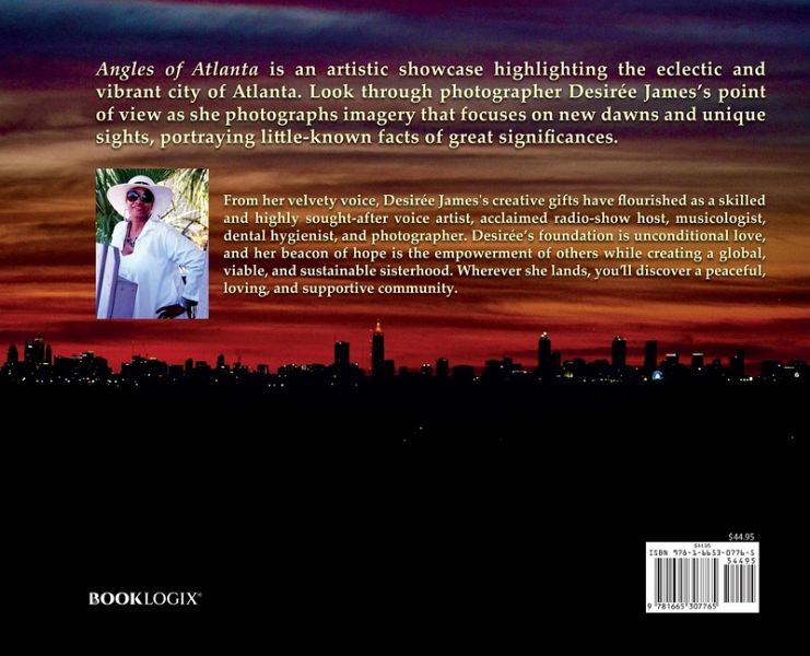 Angles of Atlanta introduces the photographic artistic expressions of diasporic photojournalist and street photographer, Desiree James. As a historic documentarian, she exposes an examination of her artistry, a picturesque pilgrimage throughout Atlanta. Desiree's photography evokes emotions, pays homage to history, painting pictures of Atlanta's past, capturing the pulse of the present, giving hope lighting the way forward to a better future. She celebrates triumphs with insight and wisdom she captures tragedies, and transitional periods of time. Her empathetic imagery is evocative, while revealing the struggles of humankind and the vulnerability of the most marginalized. Angles of Atlanta opens with an eastern view captured from the artist's westerly position, the rising sun above Midtown. As the artist unfolds, you will also discover a compelling viewpoint from Atlanta's Jackson Street Bridge. Desiree captured a prolific and frightening time in history, a day when life as we knew it ended, when the world came to an abrupt halt, when death was prevalent and uncertainty became the norm, when it seemed that time stood still, the pandemic.. Through her lens she exposes a cornucopia of reflections, from artists to architecture, from sunrises to sunsets, a movie mogul to music venues, a former United States president, a current sitting Vice President, to politicians. Throughout the captured images of these pages you will meet the eclectic, soulful and gifted artist, whose vibe is beauty and whose essence is peace, Desiree James, Every picture captivates spectrums of her spirit and prisms of her soul. As you turn the pages, you will be mesmerized. Awestruck with wonder as her optics paint pictures that will leave you breathless. Angles of Atlanta is a transformative work of art.