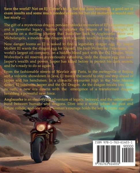 Save the world? Not on EJ Carver's to do list that June morning - a good set of exam results and some much needed repairs for her old motorbike would suit her nicely ... The gift of a mysterious dragon pendant unlocks memories of EJ's forgotten past and a powerful legacy. Invited to uncover the secrets of her birthright, EJ embarks on a thrilling journey that leads her back to Anglezarke Moor and Michelangelo, a modern-day dragon with a golden touch for making money. Now danger looms as EJ is tasked to find a legendary dragon egg. For Jasper Moffett III wants the dragon egg for himself. He built Wolverine Petroleum, the world's largest oil company, on a hidden blood pact with the Oil Dragon. With Wolverine's oil reserves mysteriously vanishing, only the dragon egg can save Jasper's wealth and power. Jasper has killed before to protect his dark secrets, and he's ready to do so again ... From the fashionable streets of Mayfair and Paris, to the metropolis of Beijing and a volcanic showdown in Java, EJ travels the world to stay one step ahead of Jasper and his henchmen. In a climactic encounter high in the New Mexico desert, EJ confronts Jasper and the Oil Dragon. As the dragon breaks free from its oath, a new era dawns with the emergence of a transformed dragon, heralding a powerful new force. Anglezarke is an electrifying adventure of legacy, betrayal, and the unbreakable bond between humans and dragons. Dive into a world where the past and future collide, and one young woman's courage holds the key to a new age.