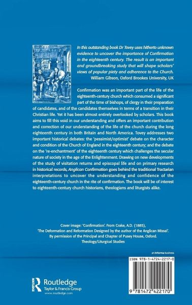 Confirmation was an important part of the life of the eighteenth-century church which consumed a significant part of the time of bishops, of clergy in their preparation of candidates, and of the candidates themselves in terms of a transition in their Christian life. Yet it has been almost entirely overlooked by scholars. This book aims to fill this void in our understanding, and offers an important contribution and correction of our understanding of the life of the church during the long eighteenth century in both Britain and North America. Tovey addresses two important historical debates: the 'pessimist/optimist' debate on the character and condition of the Church of England in the eighteenth century; and the debate on the 're-enchantment' of the eighteenth century which challenges the secular nature of society in the age of the Enlightenment. Drawing on new developments of the study of visitation returns and episcopal life and on primary research in historical records, Anglican Confirmation goes behind the traditional Tractarian interpretations to uncover the understanding and confidence of the eighteenth-century church in the rite of confirmation. The book will be of interest to eighteenth-century church historians, theologians and liturgists alike.