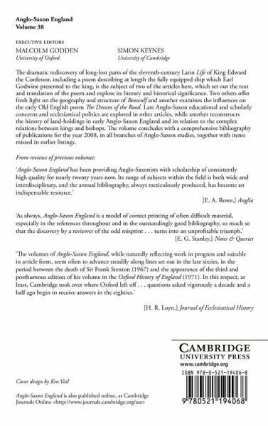 Anglo-Saxon England was the first publication to consistently embrace all the main aspects of study of Anglo-Saxon history and culture - linguistic, literary, textual, palaeographic, religious, intellectual, historical, archaeological and artistic - and which promotes the more unusual interests - in music or medicine or education, for example. Articles in volume 38 include: The Passio Andreae and The Dream of the Rood by Thomas D. Hill, Beowulf off the Map by Alfred Hiatt, Numerical Composition and Beowulf: A Re-consideration by Yvette Kisor, 'The Landed Endowment of the Anglo-Saxon Minster at Hanbury (Worcs.) by Steven Bassett, Scapegoating the Secular Clergy: The Hermeneutic Style as a Form of Monastic Self-Definition by Rebecca Stephenson, Understanding Numbers in MS London, British Library Harley by Daniel Anlezark, Tudor Antiquaries and the Vita Ædwardi Regis by Henry Summerso and Earl Godwine's Ship by Simon Keynes and Rosalind Love. A comprehensive bibliography concludes the volume, listing publications on Anglo-Saxon England during 2008.