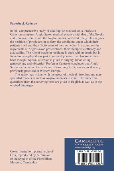 This is the first book to make a comprehensive study of Old English medical texts. Professor Cameron compares Anglo-Saxon medical practice with that of the Greeks and Romans from whom the Anglo-Saxons borrowed freely. He analyses the position of physicians in society, the conditions under which their patients lived and the effectiveness of their remedies. He examines the ingredients of Anglo-Saxon prescriptions, their therapeutic efficacy and availability. The role of magic in medicine is dealt with in depth, but found to have played less part in medical practice than has sometimes been thought. Special attention is given to surgery, bloodletting, gynaecology and obstetrics. Professor Cameron concludes that Anglo-Saxon medicine, on the evidence of surviving texts, was as good as any previously practised in Western Europe. The author has written with the needs of medical historians and non-specialist readers as well as Anglo-Saxonists in mind. The numerous quotations from the surviving texts are given in English as well as in the original languages.