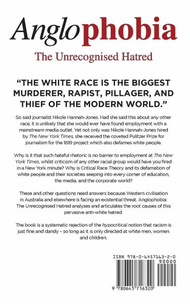 "The white race is the biggest murderer, rapist, pillager, and thief of the modern world." So said journalist Nikole Hannah-Jones. Had she said this about any other race, it is unlikely that she would ever have found employment with a mainstream media outlet. Yet not only was Nikole Hannah-Jones hired by The New York Times; she received the coveted Pulitzer Prize for journalism for the 1619 project which also defames white people. Why is it that such hateful rhetoric is no barrier to employment at The New York Times, whilst criticism of any other racial group would have you fired in a New York minute? Why is Critical Race Theory and its defamation of white people and their societies seeping into every corner of education, the media, and the corporate world? These and other questions need answers because Western civilisation in Australia and elsewhere is facing an existential threat. Anglophobia The Unrecognised Hatred analyses and articulates the root causes of this pervasive anti-white hatred. The book is a systematic rejection of the hypocritical notion that racism is acceptable - so long as it is only directed at white men, women and children.