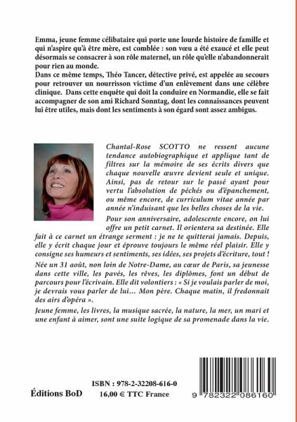 Emma, jeune femme célibataire qui porte une lourde histoire de famille et qui n'aspire qu'à être mère, est comblée : son voeu a été exaucé et elle peut désormais se consacrer à son rôle maternel, un rôle qu'elle n'abandonnerait pour rien au monde.Dans ce même temps, Théo Tancer, détective privé, est appelée au secours pour retrouver un nourrisson victime d'un enlèvement dans une célèbre clinique. Dans cette enquête qui doit la conduire en Normandie, elle se fait accompagner de son ami Richard Sonntag, dont les connaissances peuvent lui être utiles, mais dont les sentiments à son égard sont assez ambigus.