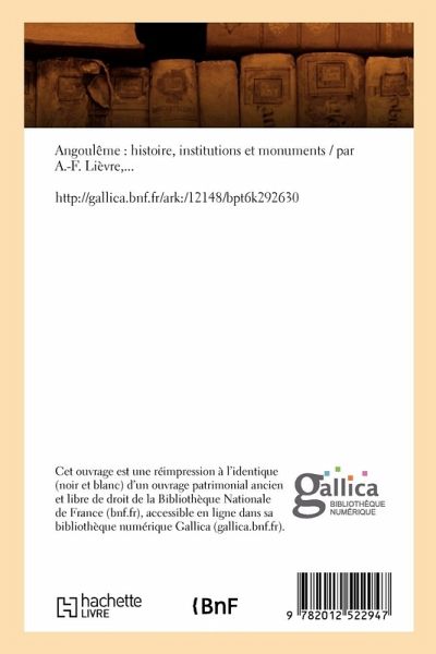 Angouleme: histoire, institutions et monuments / par A.-F. Lievre, ...Date de l'edition originale: 1885Sujet de l'ouvrage: Angouleme (Charente) -- HistoireCe livre est la reproduction fidele d'une oeuvre publiee avant 1920 et fait partie d'une collection de livres reimprimes a la demande editee par Hachette Livre, dans le cadre d'un partenariat avec la Bibliotheque nationale de France, offrant l'opportunite d'acceder a des ouvrages anciens et souvent rares issus des fonds patrimoniaux de la BnF.Les oeuvres faisant partie de cette collection ont ete numerisees par la BnF et sont presentes sur Gallica, sa bibliotheque numerique.En entreprenant de redonner vie a ces ouvrages au travers d'une collection de livres reimprimes a la demande, nous leur donnons la possibilite de rencontrer un public elargi et participons a la transmission de connaissances et de savoirs parfois difficilement accessibles.Nous avons cherche a concilier la reproduction fidele d'un livre ancien a partir de sa version numerisee avec le souci d'un confort de lecture optimal. Nous esperons que les ouvrages de cette nouvelle collection vous apporteront entiere satisfaction.Pour plus d'informations, rendez-vous sur www.hachettebnf.frhttp: //gallica.bnf.fr/ark: /12148/bpt6k292630
