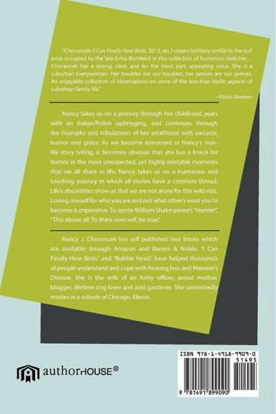 Nancy takes us on a journey through her childhood years with an Italian/Polish upbringing, and continues through the triumphs and tribulations of her adulthood with sarcastic humor and grace. As we become immersed in Nancy's true-life story telling, it becomes obvious that she has a knack for humor in the most unexpected, yet highly relatable moments that we all share in life. Nancy takes us on a humorous and touching journey in which all stories have a common thread: Life's absurdities show us that we are not alone for this wild ride. Loving oneself for who you are and not what other's want you to become is imperative. To quote William Shakespeare's "Hamlet", "This above all: To thine own self, be true."