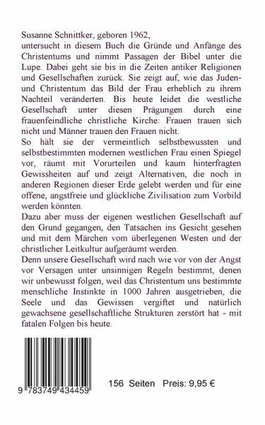 Die Autorin untersucht in diesem Buch die Gründe und Anfänge des Christentums und nimmt Passagen der Bibel unter die Lupe. Dabei geht sie bis in die Zeiten antiker Religionen und Gesellschaften zurück. Sie zeigt auf, wie das Juden- und Christentum das Bild der Frau erheblich zu ihrem Nachteil veränderten. Bis heute leidet die westliche Gesellschaft unter diesen Prägungen durch eine frauenfeindliche christliche Kirche: Frauen trauen sich nicht und Männer trauen den Frauen nicht. So hält sie der vermeintlich selbstbewussten und selbstbestimmten modernen westlichen Frau einen Spiegel vor, räumt mit Vorurteilen und kaum hinterfragten Gewissheiten auf und zeigt Alternativen, die noch in anderen Regionen dieser Erde gelebt werden und für eine offene, angstfreie und glückliche Zivilisation zum Vorbild werden könnten. Dazu aber muss der eigenen westlichen Gesellschaft auf den Grund gegangen, den Tatsachen ins Gesicht gesehen und mit dem Märchen vom überlegenen Westen und der christlichenLeitkultur aufgeräumt werden. Denn unsere Gesellschaft wird nach wie vor von der Angst vor Versagen unter unsinnigen Regeln bestimmt, denen wir unbewusst folgen, weil das Christentum uns bestimmte menschliche Instinkte in tausend Jahren ausgetrieben, die Seele und das Gewissen vergiftet und natürlich gewachsene gesellschaftliche Strukturen zerstört hat - mit fatalen Folgen bis heute.