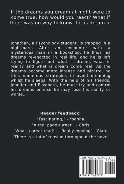 Jonathan, a Psychology student, is trapped in a nightmare. After an encounter with a mysterious man in a bookshop, he finds his dreams re-enacted in real life, and he is left trying to figure out what is dream, what is reality and what is dream come real. As the dreams become more intense and bizarre, he tries numerous strategies to avoid dreaming whilst he sleeps. With the help of his friends, Jennifer and Elizabeth, he has to try and control his dreams or else he may lose his sanity or worse... Reader feedback "Fascinating," - Joanna "A real page-turner..." - Chris "What a great read! ... Really moving" - Clare "There is a lot of tension throughout the novel that kept me reading" - Nicole