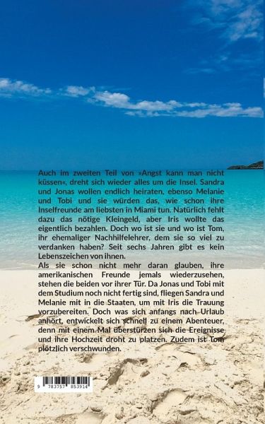 Auch im zweiten Teil von »Angst kann man nicht küssen«, dreht sich wieder alles um die Insel. Sandra und Jonas wollen endlich heiraten, ebenso Melanie und Tobi und sie würden das, wie schon ihre Inselfreunde am liebsten in Miami tun. Natürlich fehlt dazu das nötige Kleingeld, aber Iris wollte das eigentlich bezahlen. Doch wo ist sie und wo ist Tom, ihr ehemaliger Nachhilfelehrer, dem sie so viel zu verdanken haben? Seit sechs Jahren gibt es kein Lebenszeichen von ihnen.Als sie schon nicht mehr daran glauben, ihre amerikanischen Freunde jemals wiederzusehen, stehen die beiden vor ihrer Tür. Da Jonas und Tobi mit dem Studium noch nicht fertig sind, fliegen Sandra und Melanie mit in die Staaten, um mit Iris die Trauung vorzubereiten. Doch was sich anfangs nach Urlaub anhört, entwickelt sich schnell zu einem Abenteuer, denn mit einem Mal überstürzen sich die Ereignisse und ihre Hochzeit droht zu platzen. Zudem ist Tom plötzlich verschwunden.