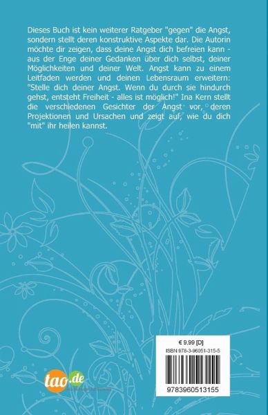 Dieses Buch ist kein weiterer Ratgeber "gegen" die Angst, sondern stellt deren konstruktive Aspekte dar. Die Autorin will dir zeigen, dass die Angst dich befreien kann; aus der Enge deiner Gedanken à ber dich selbst, deiner Mà glichkeiten und deiner Welt. Angst kann zu deinem Leitfaden werden und deinen Lebensraum erweitern: "Stelle dich deiner Angst. Wenn du durch sie hindurch gehst, entsteht Freiheit - alles ist mà glich!" Ina Kern stellt die verschiedenen Gesichter der Angst vor, deren Projektionen und Ursachen und zeigt auf, wie du dich selbst heilen kannst.