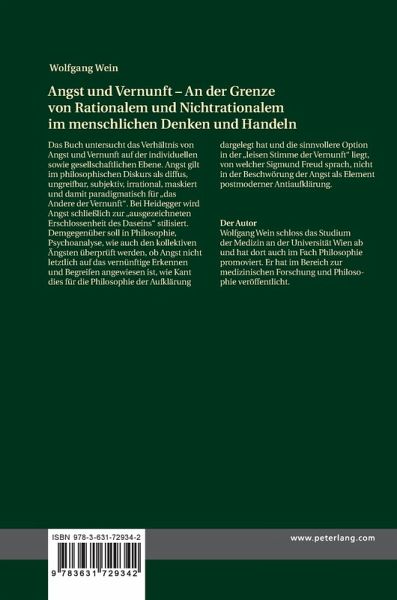 Das Buch untersucht das Verhältnis von Angst und Vernunft auf der individuellen sowie gesellschaftlichen Ebene. Angst gilt im philosophischen Diskurs als diffus, ungreifbar, subjektiv, irrational, maskiert und damit paradigmatisch für «das Andere der Vernunft». Bei Heidegger wird Angst schließlich zur «ausgezeichneten Erschlossenheit des Daseins» stilisiert. Demgegenüber soll in Philosophie, Psychoanalyse, wie auch den kollektiven Ängsten überprüft werden, ob Angst nicht letztlich auf das vernünftige Erkennen und Begreifen angewiesen ist, wie Kant dies für die Philosophie der Aufklärung dargelegt hat und die sinnvollere Option in der «leisen Stimme der Vernunft» liegt, von welcher Sigmund Freud sprach, nicht in der Beschwörung der Angst als Element postmoderner Antiaufklärung.