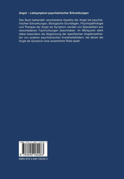 Angst ist ein natürlicher Bestandteil unseres Lebens und dient in dieser Funktion als Schutz, um entwicklungsgeschichtlich das Überleben der Art zu gewährleisten. Von dieser natürlichen Angst muß eine pathologische Angst, die im Rahmen psychiatrischer Erkrankungen auftritt, bzw. auch als Eigenerkrankung vorkommen kann, unterschieden werden. Übergänge von der normalen zur pathologischen Angst sind fließend. Das Buch behandelt verschiedene Aspekte der Angst, wobei im Vordergrund die Beziehung der Angst zu anderen psychiatrischen Erkrankungen steht. Theoretische biologische Grundlagen, Psychopathologie und Therapie der Angst als Symptom werden von Spezialisten aus verschiedenen Fachrichtungen beschrieben. Die Zuordnung der Angst zu anderen psychiatrischen Krankheitsbildern wird besonders hervorgehoben, bzw. von den spezifischen Angstkrankheiten abgegrenzt.