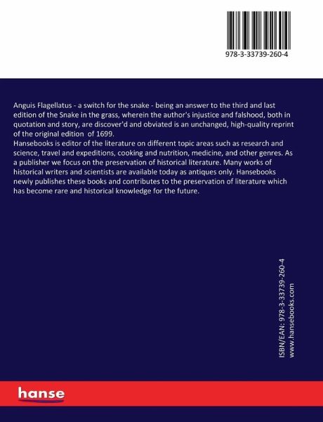 Anguis Flagellatus - a switch for the snake - being an answer to the third and last edition of the Snake in the grass, wherein the author's injustice and falshood, both in quotation and story, are discover'd and obviated is an unchanged, high-quality reprint of the original edition of 1699.