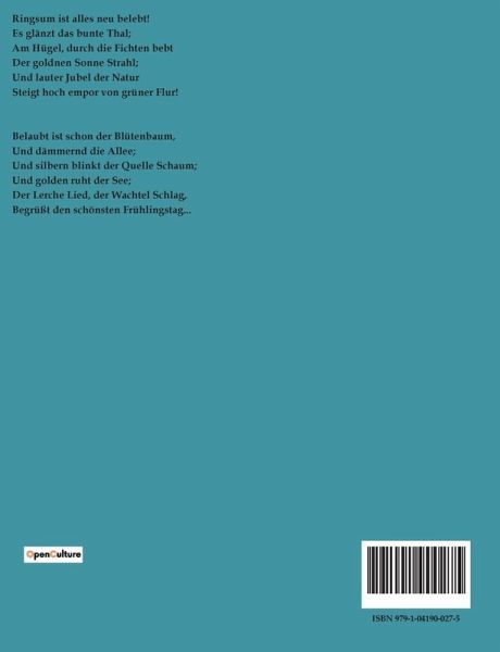 Ringsum ist alles neu belebt! Es glänzt das bunte Thal; Am Hügel, durch die Fichten bebt Der goldnen Sonne Strahl; Und lauter Jubel der Natur Steigt hoch empor von grüner Flur! Belaubt ist schon der Blütenbaum, Und dämmernd die Allee; Und silbern blinkt der Quelle Schaum; Und golden ruht der See; Der Lerche Lied, der Wachtel Schlag, Begrüßt den schönsten Frühlingstag...