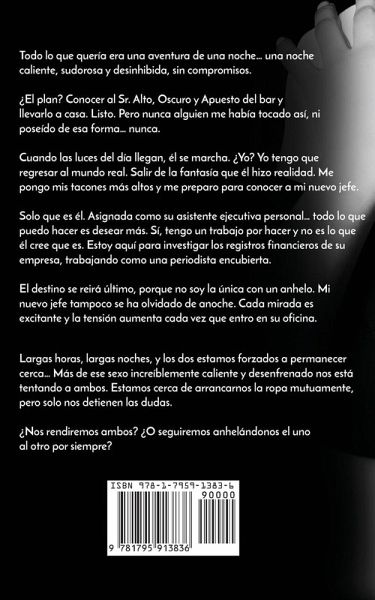 Todo lo que quería era una aventura de una noche... una noche caliente, sudorosa y desinhibida, sin compromisos. ¿El plan? Conocer al Sr. Alto, Oscuro y Apuesto del bar y llevarlo a casa. Listo. Pero nunca alguien me había tocado así, ni poseído de esa forma... nunca. Cuando las luces del día llegan, él se marcha. ¿Yo? Yo tengo que regresar al mundo real. Salir de la fantasía que él hizo realidad. Me pongo mis tacones más altos y me preparo para conocer a mi nuevo jefe. Solo que es él. Asignada como su asistente ejecutiva personal... todo lo que puedo hacer es desear más. Sí, tengo un trabajo por hacer y no es lo que él cree que es. Estoy aquí para investigar los registros financieros de su empresa, trabajando como una periodista encubierta. El destino se reirá último, porque no soy la única con un anhelo. Mi nuevo jefe tampoco se ha olvidado de anoche. Cada mirada es excitante y la tensión aumenta cada vez que entro en su oficina. Largas horas, largas noches, y los dos estamos forzados a permanecer cerca... Más de ese sexo increíblemente caliente y desenfrenado nos está tentando a ambos. Estamos cerca de arrancarnos la ropa mutuamente, pero solo nos detienen las dudas. ¿Nos rendiremos ambos? ¿O seguiremos anhelándonos el uno al otro por siempre?