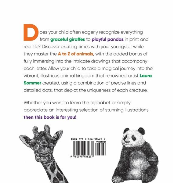 Does your child often eagerly recognize everything from graceful giraffes to playful pandas in print and real life? Discover exciting times with your youngster while they master the A to Z of animals, with the added bonus of fully immersing into the intricate drawings that accompany each letter. Allow your child to take a magical journey into the vibrant, illustrious animal kingdom that renowned artist Laura Sommer created, using a combination of precise lines and detailed dots, that depict the uniqueness of each creature. Whether you want to learn the alphabet or simply appreciate an interesting selection of stunning illustrations, then this book is for you! This book features child-friendly font with both uppercase and lowercase letters from A-Z. Each letter is printed in either a primary or secondary color. It features black pen illustrations of the following animals: Alligator, Bison, Cow, Dog, Elephant, Frog, Giraffe, Hippopotamus, Iguana, Jellyfish, Koala, Llama, Moose, Narwhal, Octopus, Panda, Quail, Raccoon, Sloth, Tiger, Unicorn, Vixen, Wolf, Xerus, Yak and Zebra.