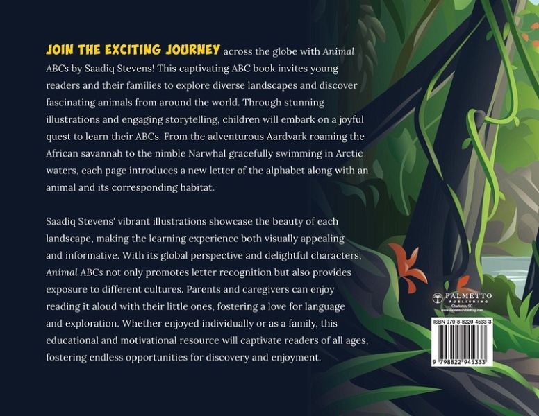 Discover the ABCs in a Global Adventure with Enchanting Animals! Dive into the vibrant world of Animal ABCs by Saadiq Stevens, a captivating and educational journey designed to make learning the alphabet an exciting adventure for young readers and their families. Join the adventurous Aardvark as it explores the African savannah and witness the nimble Narwhal gracefully swimming in Arctic waters. Each letter introduces a new animal in its unique habitat, fostering letter recognition while providing a cultural exploration of diverse landscapes around the world. Saadiq Stevens' exquisite illustrations bring these enchanting scenes to life, captivating the imagination of young minds and fostering a love for language and exploration. Parents and caregivers can engage with their little ones, reading aloud and creating lasting bonds through this interactive learning experience. Animal ABCs is not just a tool for letter recognition but also a motivational resource for children on their exciting journey toward reading and writing proficiency. Designed for both independent learning and family enjoyment, this book serves as a cherished addition to any child's library. Its global perspective, delightful characters, and interactive storytelling ensure endless opportunities for discovery and enjoyment. Get ready for a thrilling ABC adventure that goes beyond the basics, offering a unique blend of education and entertainment. Animal ABCs is more than a book; it's a passport to a world of knowledge and joy.