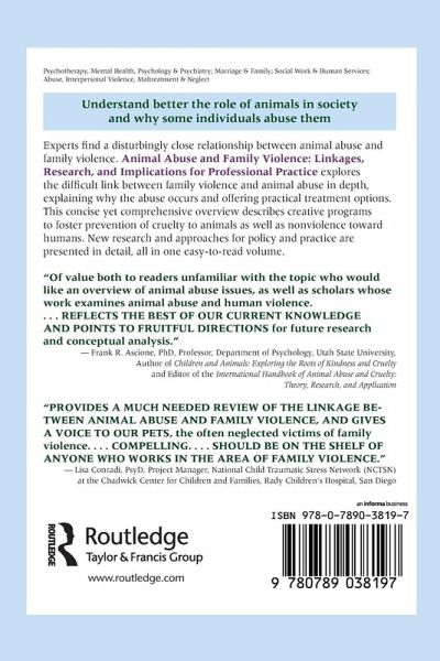 Experts find a disturbingly close relationship between animal abuse and family violence. Animal Abuse and Family Violence: Linkages, Research, and Implications for Professional Practice explores the difficult link between family violence and animal abuse in depth, explaining why the abuse occurs and offering practical treatment options.