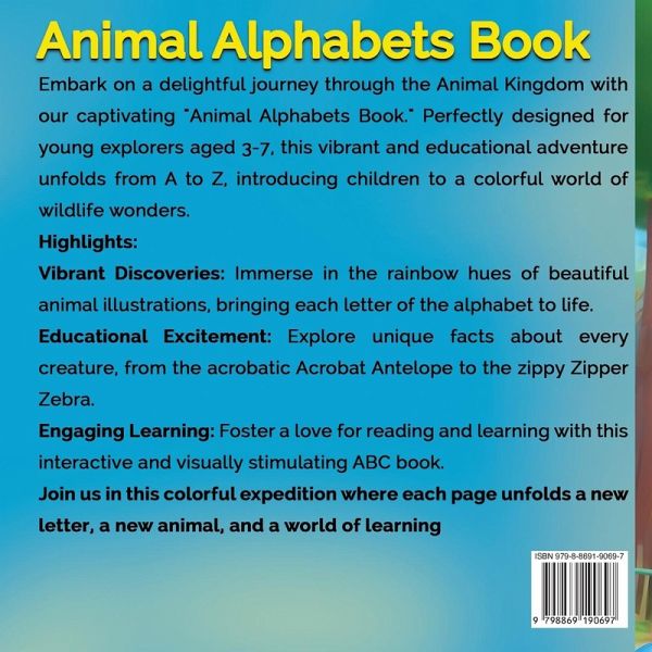 Introducing "Animal Alphabets Book: Unveiling Unique Facts and Vibrant Animals for Young Explorers" ¿¿¿¿¿¿¿¿¿ Book Highlights: Size: Perfectly sized at 8.5 x 8.5 inches for little hands to hold and explore. Animal Alphabet: Embark on an alphabetical adventure from A to Z, guiding young explorers through the wonders of the Animal Kingdom. Vibrant, Beautiful Animal Illustrations:Immerse young minds in a riot of colors with stunning, handcrafted illustrations. Each page bursts to life with captivating visuals, making the Animal Alphabet an enchanting journey. Unique Facts About Each Animal:Uncover fascinating details about every animal in the alphabet, sparking curiosity and learning. From the acrobatic Acrobat Antelope to the zippy Zipper Zebra, each creature comes alive with engaging and age-appropriate facts. Educational Entertainment for Young Readers (Aged 3-7):Combines the joy of exploration with valuable learning experiences. Ideal for bedtime stories, playtime adventures, and interactive learning sessions. Perfect for Families and Classrooms:An essential addition to home libraries and early education settings. Encourage a love for reading and a fascination with the diverse animal kingdom. Join the Adventure:Engage young explorers in a colorful expedition where the alphabet meets the animal kingdom. Foster a lifelong love for learning with a book that's as entertaining as it is educational. Animal Alphabets Book" - Where Every Page Sparks Imagination and Unveils the Magic of Learning!"