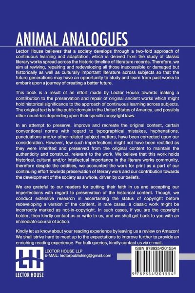 Animal Analogues: Verses And Illustrations This book is a result of an effort made by us towards making a contribution to the preservation and repair of original classic literature. In an attempt to preserve, improve and recreate the original content, we have worked towards: 1. Type-setting & Reformatting: The complete work has been re-designed via professional layout, formatting and type-setting tools to re-create the same edition with rich typography, graphics, high quality images, and table elements, giving our readers the feel of holding a 'fresh and newly' reprinted and/or revised edition, as opposed to other scanned & printed (Optical Character Recognition - OCR) reproductions. 2. Correction of imperfections: As the work was re-created from the scratch, therefore, it was vetted to rectify certain conventional norms with regard to typographical mistakes, hyphenations, punctuations, blurred images, missing content/pages, and/or other related subject matters, upon our consideration. Every attempt was made to rectify the imperfections related to omitted constructs in the original edition via other references. However, a few of such imperfections which could not be rectified due to intentional\unintentional omission of content in the original edition, were inherited and preserved from the original work to maintain the authenticity and construct, relevant to the work. We believe that this work holds historical, cultural and/or intellectual importance in the literary works community, therefore despite the oddities, we accounted the work for print as a part of our continuing effort towards preservation of literary work and our contribution towards the development of the society as a whole, driven by our beliefs. We are grateful to our readers for putting their faith in us and accepting our imperfections with regard to preservation of the historical content. HAPPY READING!