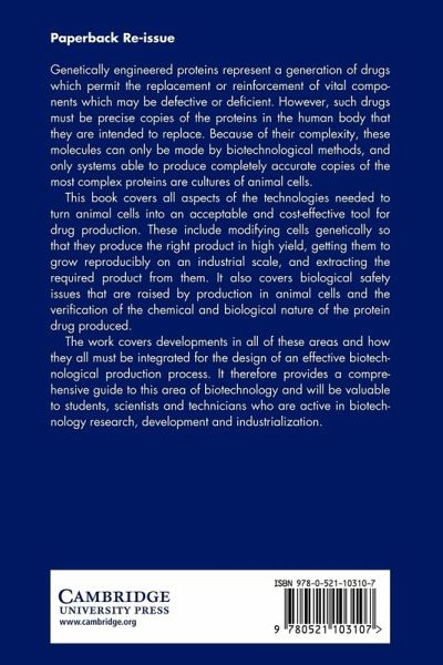 Because of their complexity, the new generation of genetically engineered protein drugs can only be made by biotechnological methods, using cultures of animal cells. This book covers all aspects of the technologies needed to turn animal cells into an acceptable and cost-effective tool for drug production. This includes modifying them genetically so that they produce the right product in high yield, getting them to grow reproducibly on an industrial scale, and extracting the required product from them. It also covers biological safety issues, and the verification of the chemical and biological nature of the protein drug produced. The work covers developments in all of these areas and how they all need to be integrated for the design of an effective biotechnological production process. It therefore provides a comprehensive guide to this area of biotechnology.
