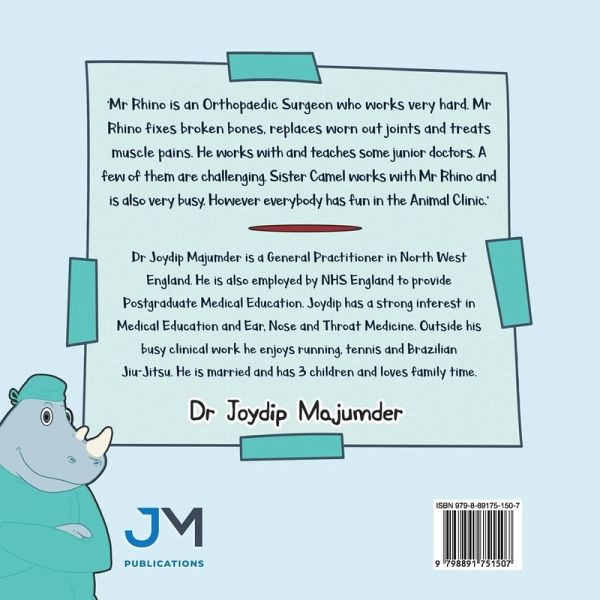 Mr Rhino is an Orthopaedic Surgeon who works very hard. Mr Rhino fixes broken bones, replaces worn out joints and treats muscle pains. He works with and teaches some junior doctors. A few of them are challenging. Sister Camel works with Mr Rhino and is also very busy. However, everybody has fun in the Animal Clinic.