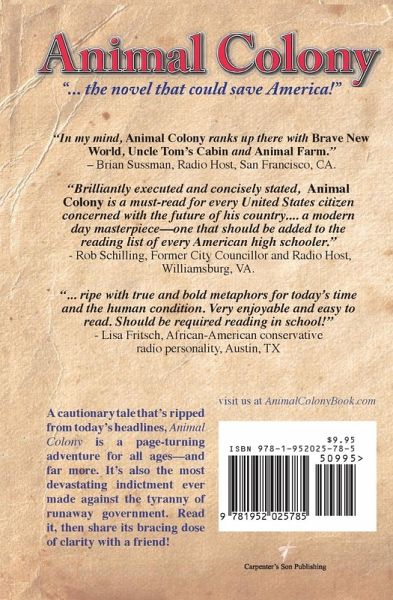 Why are people calling Animal Colony ¿the novel that will save America?¿ Because this fast-reading novel is far more than an adventure story. It¿s also a revealing trip back through American history¿¿seen through the harmless filter of a lovable band of animals.