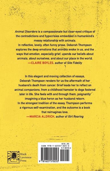 Animal disorders-those erratic, contradictory, irrational relationships that humans have with their nonhuman compatriots-abound in contemporary U.S. culture. In a series of personal essays, Deborah Thompson relates her own complicity in some of these disordered approaches to nonhuman animals, including such practices as pet-keeping, animal hoarding, animal sacrifice (both religious and scientific), magical thinking, and grieving. The sometimes funny, sometimes poignant essays in this collection deliver dispatches from one representative sufferer of animal disorders. "ANIMAL DISORDERS is a compassionate but clear-eyed critique of the contradictions and hypocrisies embedded in humankind's messy relationship with animals. In reflective, lovely, often funny prose, Deborah Thompson explores the deep emotions that animals evoke in us, and the ways that emotion, especially grief, upends our beliefs about animals, about ourselves, and about our place in the world." --Claire Boyles, author of Site Fidelity
