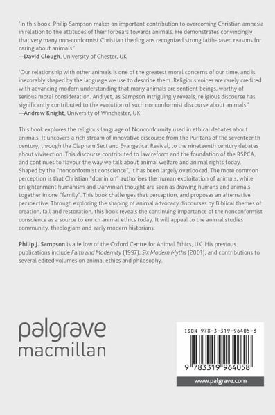 This book explores the religious language of Nonconformity used in ethical debates about animals. It uncovers a rich stream of innovative discourse from the Puritans of the seventeenth century, through the Clapham Sect and Evangelical Revival, to the nineteenth century debates about vivisection. This discourse contributed to law reform and the foundation of the RSPCA, and continues to flavour the way we talk about animal welfare and animal rights today. Shaped by the "nonconformist conscience", it has been largely overlooked. The more common perception is that Christian "dominion" authorises the human exploitation of animals, while Enlightenment humanism and Darwinian thought are seen as drawing humans and animals together in one "family". This book challenges that perception, and proposes an alternative perspective. Through exploring the shaping of animal advocacy discourses by Biblical themes of creation, fall and restoration, this book reveals the continuing importance of the nonconformist conscience as a source to enrich animal ethics today. It will appeal to the animal studies community, theologians and early modern historians.
