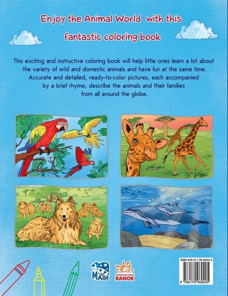 This exciting and instructive coloring book will help children and adults to immerse themselves into the diverse world of wild and domestic animal families as well as of our beloved pets and have fun at the same time. Accurate and detailed, ready-to-color pictures, each accompanied by a brief humorous rhyme, describe the animals and their families from all around the globe. You can enjoy spending your time in the family lounge with all these famous animals and their babies. Leopards and Lions, Elephants and Bears, Giraffes and Kangaroos, Raccoons and Wolfs, Zebras and Pony, Pandas, Cats, Dogs, and many others are waiting to be colored. Grab this book and get the whole family entertained as well as enjoy the Stress Relieving coloring adventure! See the whole list of contents below: 4 - The Elephant, 5 - The Brown Bear, 6 - The Giraffe, 7 - The Raccoon, 8 - The Kangaroo, 9 - The Wolf, 10 - The Roe Deer, 11 - The Polar Bear, 12 - The Orangutan, 13 - The Beaver, 14 - The Tiger, 15 - The Squirrel, 16 - The Hare, 17 - The Monkey, 18 - The Badger, 19 - The Hippo, 20 - The Wild Boar, 21 - The Macaw, 22 - The Fox, 23 - The Zebra, 24 - The Moose, 25 - The Koala, 26 - The Lynx, 27 - The Mouse, 28 - The Leopard, 29 - The Hedgehog, 30 - The Deer, 31 - The Rhino, 32 - The Pekingese, 33 - The Kitten, 34 - The Bunny, 35 - The Chinchilla, 36 - The Dog, 37 - The Persian Cat, 38 - The Hamster, 39 - The Guinea Pig, 40 - The Siamese Cat, 41 - The Rabbit, 42 - The Cow, 43 - The Goose, 44 - The Donkey, 45 - The Duck, 46 - The Rooster, 47 - The Goat, 48 - The Horse, 49 - The Turkey, 50 - The Pig, 51 - The Pony, 52 - The Sheep, 53 - The Scottish Collie, 54 - The Swan, 55 - The Panda, 56 - The Dolphin, 57 - The Lion, 58 - Trial coloring pages.