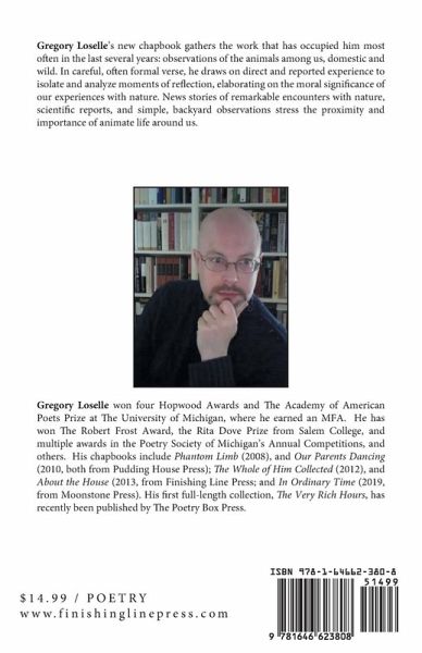 Gregory Loselle's new chapbook gathers the work that has occupied him most often in the last several years: observations of the animals among us, domestic and wild. In careful, often formal verse, he draws on direct and reported experience to isolate and analyze moments of reflection, elaborating on the moral significance of our experiences with nature. News stories of remarkable encounters with nature, scientific reports, and simple, backyard observations stress the proximity and importance of animate life around us.