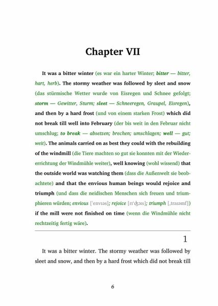Animal Farm - Ein politisches Märchen mit der Frank-Lesemethode (A2-B1)Originaltext. Ungekürzt. Verständlich. Frank-Lesemethode.Als die Tiere auf einer Farm beschließen, ihre menschlichen Herren zu vertreiben und eine gerechte Gesellschaft aufzubauen, scheint eine neue Zeit angebrochen. Doch Schritt für Schritt verwandelt sich das Ideal der Gleichheit in eine Diktatur - klug, bitter und überraschend aktuell.George Orwells Animal Farm ist eine meisterhafte Parabel über Macht, Sprache und Manipulation. Diese Ausgabe enthält den vollständigen Originaltext - nicht vereinfacht, nicht gekürzt, aber durch die bewährte Frank-Lesemethode für Englischlernende auf A2-B1-Niveau verständlich gemacht.Die Frank-Lesemethode kombiniert den Originaltext mit direkt eingefügten Übersetzungen und Erläuterungen. So wird jedes Wort verständlich - ohne den Lesefluss zu unterbrechen. Ideal, um Wortschatz, Sprachgefühl und Textverständnis ganz natürlich zu entwickeln.Ob im Selbststudium oder begleitend zum Unterricht:Animal Farm bietet nicht nur spannenden Lesestoff, sondern auch einen wirkungsvollen Zugang zur englischen Sprache - und zu einem der klügsten politischen Romane des 20. Jahrhunderts.Mit kostenlosem Hörbuch zum Mitlesen und Trainieren des Hörverstehens.Leseprobe: https://easyoriginal.com/leseproben/DE48.pdf