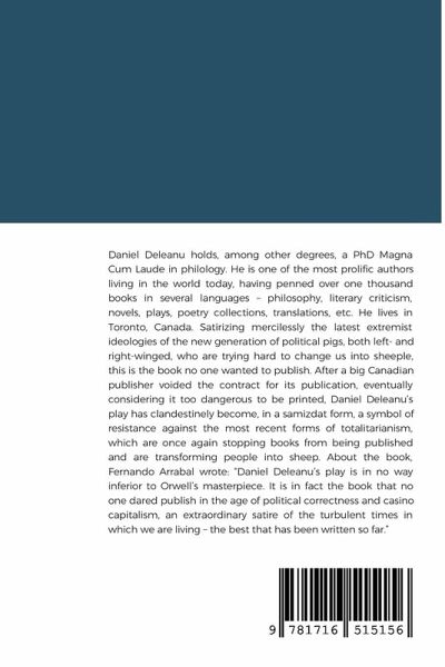 Daniel Deleanu holds, among other degrees, a PhD Magna Cum Laude in philology. He is one of the most prolific authors living in the world today, having penned over one thousand books in several languages - philosophy, literary criticism, novels, plays, poetry collections, translations, etc. He lives in Toronto, Canada. Satirizing mercilessly the latest extremist ideologies of the new generation of political pigs, both left- and right-winged, who are trying hard to change us into sheeple, this is the book no one wanted to publish. After a big Canadian publisher voided the contract for its publication, eventually considering it too dangerous to be printed, Daniel Deleanu's play has clandestinely become, in a samizdat form, a symbol of resistance against the most recent forms of totalitarianism, which are once again stopping books from being published and are transforming people into sheep. About the book, Fernando Arrabal wrote: "Daniel Deleanu's play is in no way inferior to Orwell's masterpiece. It is in fact the book that no one dared publish in the age of political correctness and casino capitalism, an extraordinary satire of the turbulent times in which we are living - the best that has been written so far."