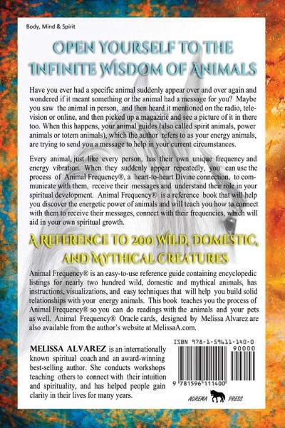 Have you ever had a specific animal suddenly appear over and over again and wondered if it meant something or the animal had a message for you? Maybe you saw the animal in person, and then heard it mentioned on the radio, television or online, and then picked up a magazine and see a picture of it in there too. When this happens, your animal guides (also called spirit animals or totem animals), which Melissa Alvarez refers to as your energy animals, are trying to send you a message to help in your current circumstances. Every animal, just like every person, has their own unique frequency and energy vibration. When they suddenly appear repeatedly, you can use the process of Animal Frequency(R), a heart-to-heart Divine connection, to communicate with them, receive their messages and understand their role in your spiritual development. Animal Frequency(R) is a reference book that will help you discover the energetic power of animals and will teach you how to connect with them to receive their messages, connect with their frequencies, which will aid in your own spiritual growth. This second edition of Animal Frequency(R) is an easy-to-use reference guide containing encyclopedic listings for nearly two hundred wild, domestic and mythical animals, has instructions, visualizations, and easy techniques that will help you build solid relationships with your energy animals. This book teaches you the process of Animal Frequency so you can do readings with the animals and with your pets as well. Animal Frequency(R) Oracle cards, designed by Melissa Alvarez are also available from the author's website at MelissaA.com.