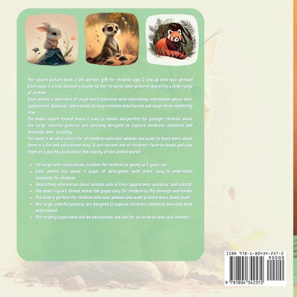 A fantastic square picture book is the perfect gift for children ages 2 and up who love animals! Each page is a real discovery thanks to large, full-color pictures depicting a wide range of animals. Each animal is described through short sentences that provide interesting information about their appearance, behavior, and habitat to keep children entertained and teach them something new. The book's square format makes it easy to handle and perfect for younger children, while the large, colorful pictures are specially designed to capture children's attention and stimulate their curiosity. This book is an ideal choice for all children who love animals and want to learn more about them in a fun and educational way. It will become one of the children's favorite books and take them on a journey to discover the beauty of the animal world! 40 large full-color illustrations, suitable for children ages 2 and up Each animal has about four pages of description, with short, easy-to-understand sentences for children Interesting information about animals, such as their appearance, behavior, and habitat The book's square format makes the pages easy for children to flip through and handle The book is perfect for children who love animals and want to learn more about them The large, colorful pictures are designed to capture children's attention and keep them entertained The reading experience will be educational and fun for all children who love animals!