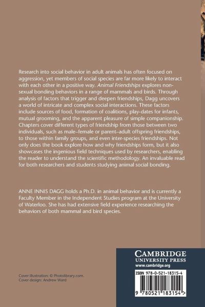 Research into social behaviour in animals has often focused on aggression, yet members of social species are far more likely to interact with each other in a positive way. Animal Friendships explores non-sexual bonding behaviours in a range of mammalian and avian species. Through analysis of factors which trigger and deepen friendships, Dagg uncovers a world of intricate and complex social interactions. These factors include sources of food, formation of coalitions, playdates for infants, mutual grooming and the apparent pleasure of simple companionship. Chapters cover different types of friendship: from those between two individuals, such as male-female or parent-offspring friendships, to those within family groups and even inter-species friendships. Not only does the book explore how and why friendships form, it also showcases the ingenious field techniques used by researchers enabling the reader to understand the scientific methodology. An invaluable read for both researchers and students studying animal social bonding.