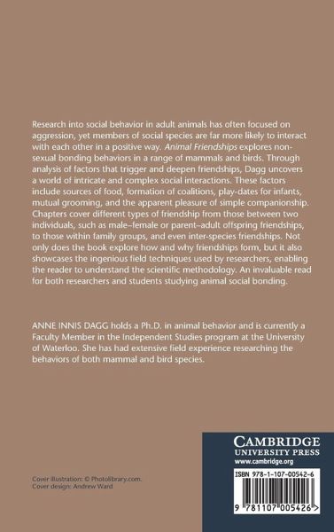 Research into social behaviour in animals has often focused on aggression, yet members of social species are far more likely to interact with each other in a positive way. Animal Friendships explores non-sexual bonding behaviours in a range of mammalian and avian species. Through analysis of factors which trigger and deepen friendships, Dagg uncovers a world of intricate and complex social interactions. These factors include sources of food, formation of coalitions, playdates for infants, mutual grooming and the apparent pleasure of simple companionship. Chapters cover different types of friendship: from those between two individuals, such as male-female or parent-offspring friendships, to those within family groups and even inter-species friendships. Not only does the book explore how and why friendships form, it also showcases the ingenious field techniques used by researchers enabling the reader to understand the scientific methodology. An invaluable read for both researchers and students studying animal social bonding.